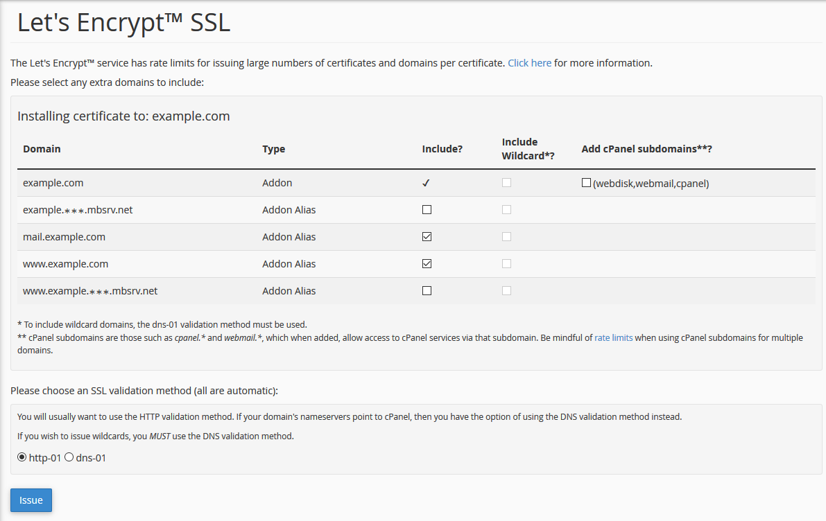 また、「http-01」「dns-01」の選択についても基本的に最初からチェックの付いている「http-01」のままで問題ありません。