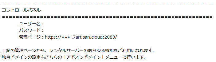 契約時に送られてくるメールに記載されている、コントロールパネルの管理ページへアクセスします。