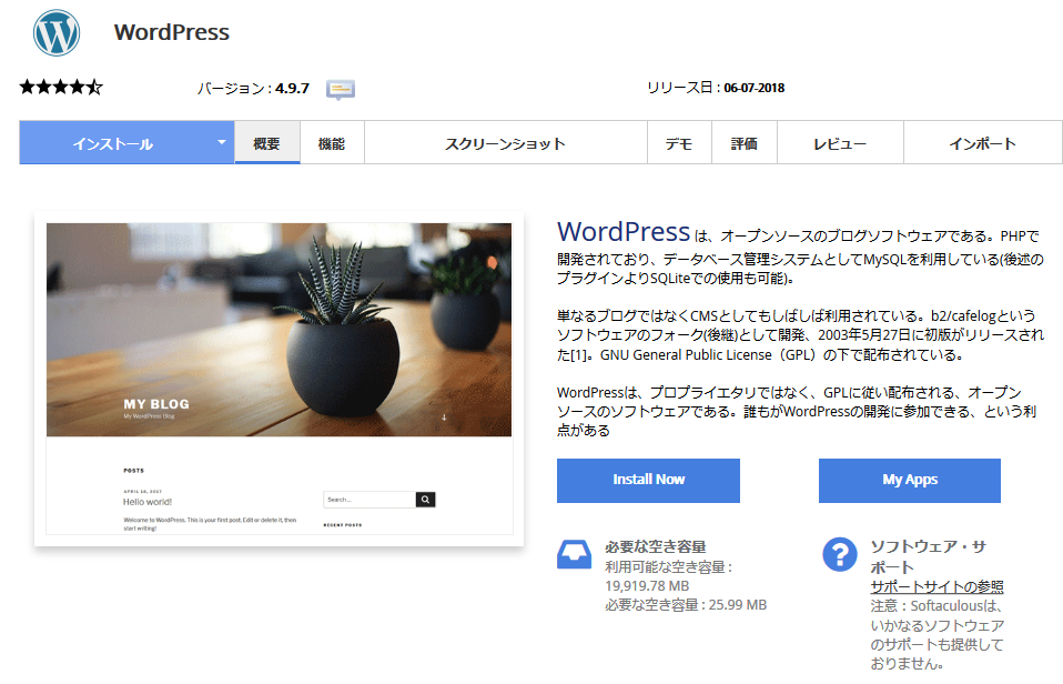 検索結果に表示されている「WordPress」をクリックすると画面右側にWordPressの情報が表示されますので「Install Now」をクリックします。