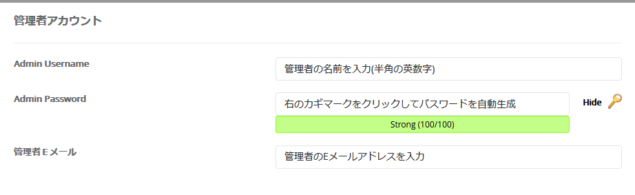 Admin Password:管理者のパスワードを指定します。右側にある鍵マークをクリックするとランダムのパスワードが発行されます。