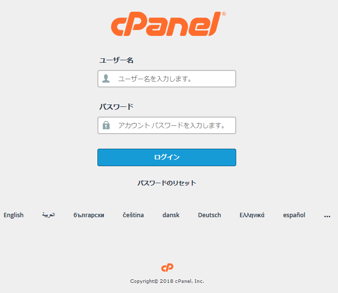 コントロールパネル(cPanel)ログインの画面が表示されるのでメールに記載されているユーザー名とパスワードを入力し「ログイン」をクリックします。
