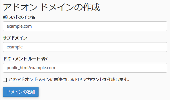 アドオンドメインの作成画面に切り替わるので、お手持ちのドメインの情報を入力します。