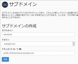今回は example.com ドメインのサブドメインとして owncloud.example.com という名前で登録したいため、以下のように入力して「作成」をクリックします。