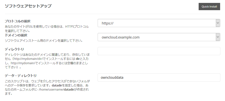 今回はexample.comのサブドメイン(owncloud.example.com)としてインストールしてみます。