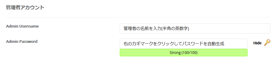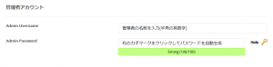 Admin Password:管理者のパスワードを指定します。右側にある鍵マークをクリックするとランダムのパスワードが発行されます。