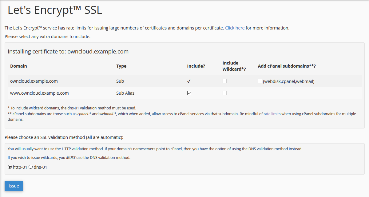 また、「http-01」「dns-01」の選択についても基本的に最初からチェックの付いている「http-01」のままで問題ありません。